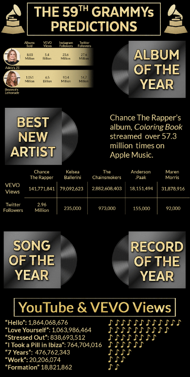 Before diving into this prediction, let’s clarify the difference between Record of the Year and Song of the Year. While each category recognizes a single, the recipients are different. Record of the Year honors the overall performance and production value i.e. how it’s recorded, while Song of the Year honors the singer/songwriter. When put into that perspective, we have to give it to Beyoncé’s “Formation.”