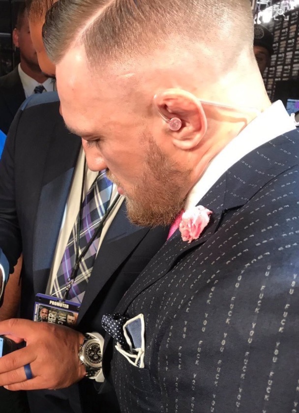 Verbal jabs aside, part of the conversation has revolved around the pinstripe suit McGregor wore on Tuesday. If you didn’t see it, the pinstripes actually spelled out the words “FUCK YOU.” The suit was a custom piece designed by David August Heil under his eponymous label. Heil, whose client roster includes Kobe Bryant, Sylvester Stallone, DJ Khaled, and even executive producer Asahd Khaled, has worked with McGregor in the past. He also dressed McGregor for his appearance in Toronto yesterday in all custom David August. But what’s the deal with the pinstripe “FUCK YOU” suit?