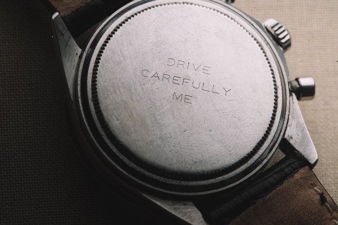 The inscription on the back of the watch in all caps: DRIVE CAREFULLY ME.