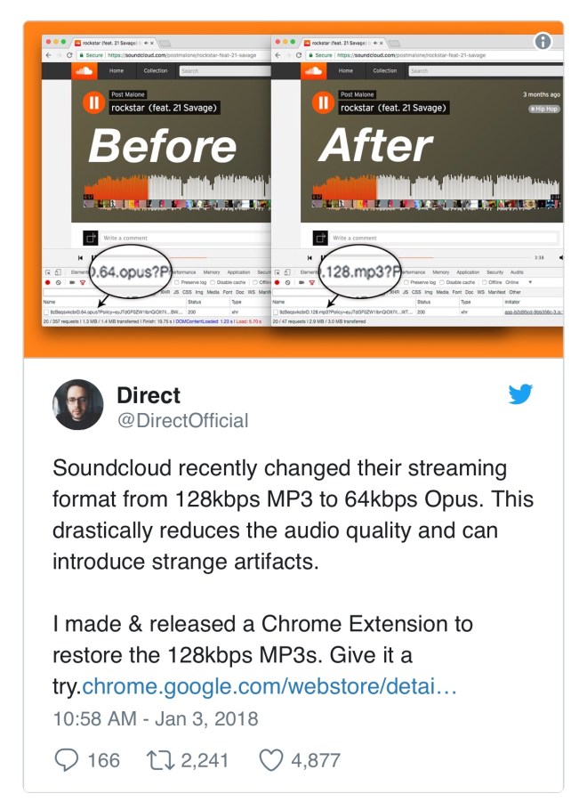 The change was initially noticed by New York-based producer Direct who saw that tracks were being shown as 64kbps Opus (below), which is actually a new audio codec which is meant to sound better than a 128kbps MP3.