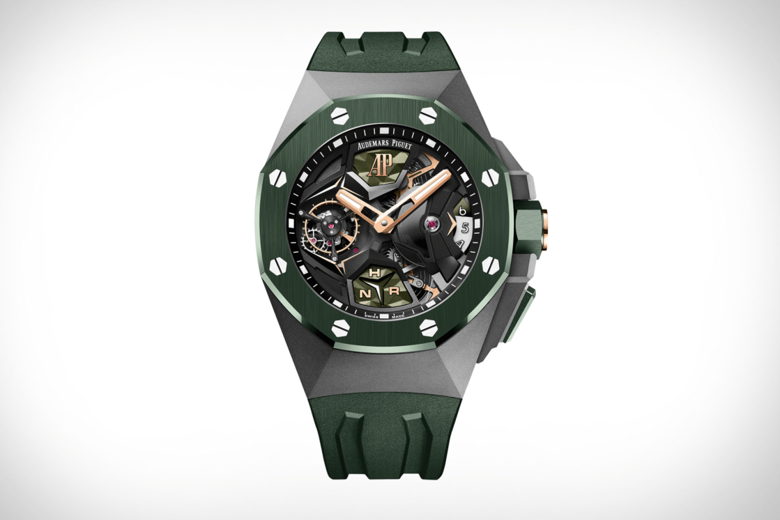 As the Royal Oak turns 50, the Concept line celebrates its 20th anniversary. Audemars Piguet marks the occasion with a brand new model. The Royal Oak Concept Flying Tourbillon GMT Watch is based around a 44mm sandblasted titanium case. It’s topped with a green ceramic bezel and features a skeletonized dial with black PVD-treated bridges, pink gold details, and green CVD-coloured inserts, while an AP caliber 2954 movement boasting an impressive 237-hour reserve powers the piece and its tourbillon function. Sold in very limited quantities, the travel watch is finished with a textured green rubber strap, echoing its verdant hue, and includes an interchangeable rubber strap.