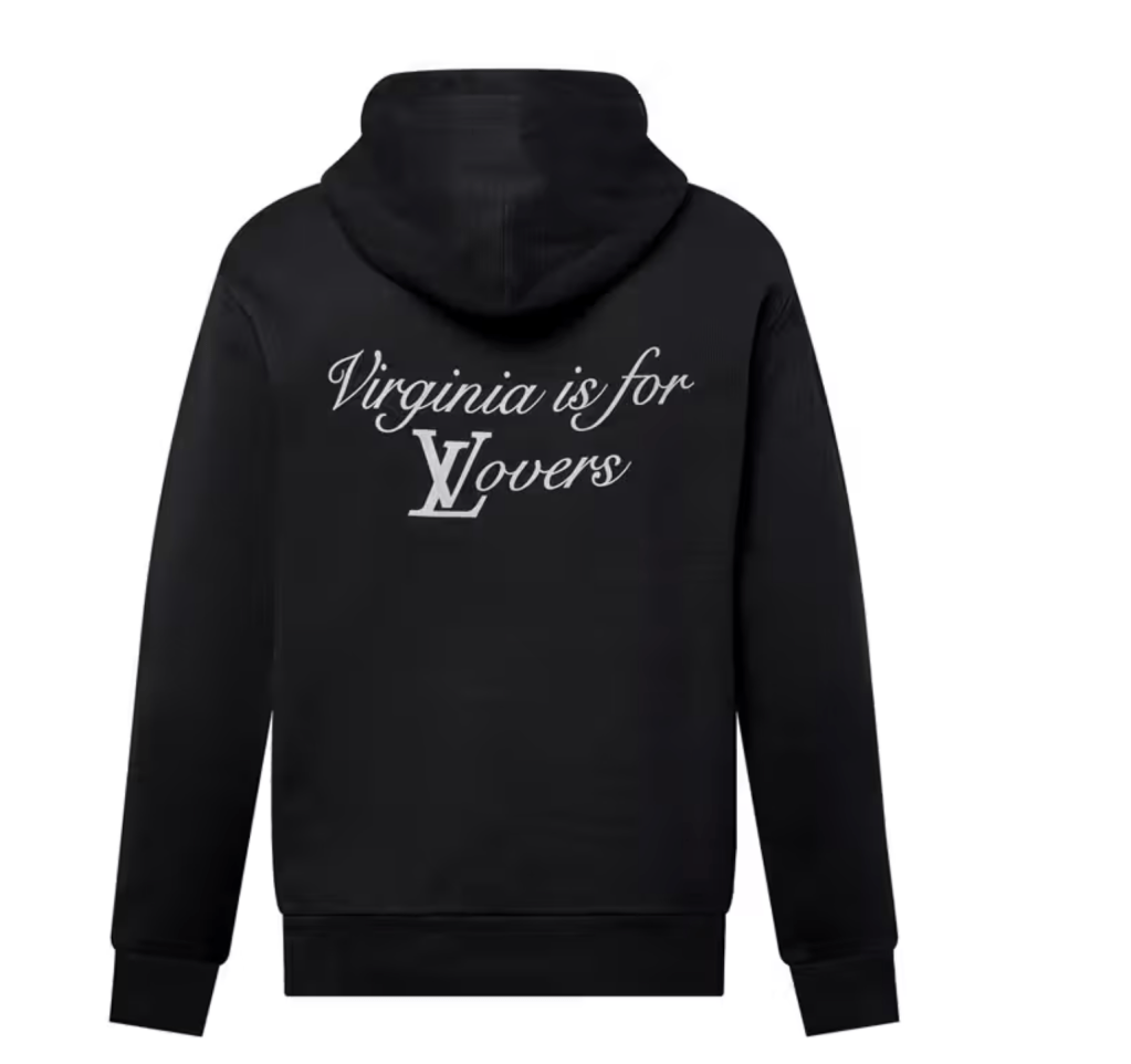 The line puts a Vuitton twist on Pharrell’s hometown state slogan: “Virgina Is For Lovers.” In bright tones, the Maison’s monogram merges with the aforementioned lettering on the front of T-shirts, while their back sides are printed with bold text reading, “PARIS TO VA, VA TO PARIS.” An identical, embroidered iteration of the collaborative slogan plants itself on the back of the denim jacket, which dons LV’s Damier print, and the hoodie alike.