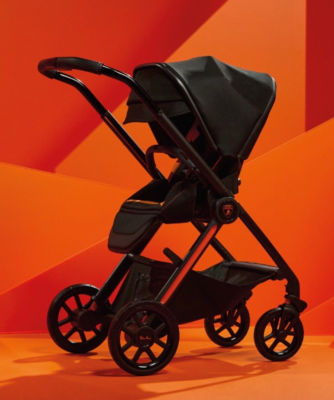 The stroller is an all-terrain powerhouse designed for comfort in any setting. It features full suspension wheels, a supercar-inspired brake pedal, and automotive-style handlebars. Luxury touches include high-performance suede, Italian leather accents, and Lamborghini’s signature orange on sleek black fabrics.